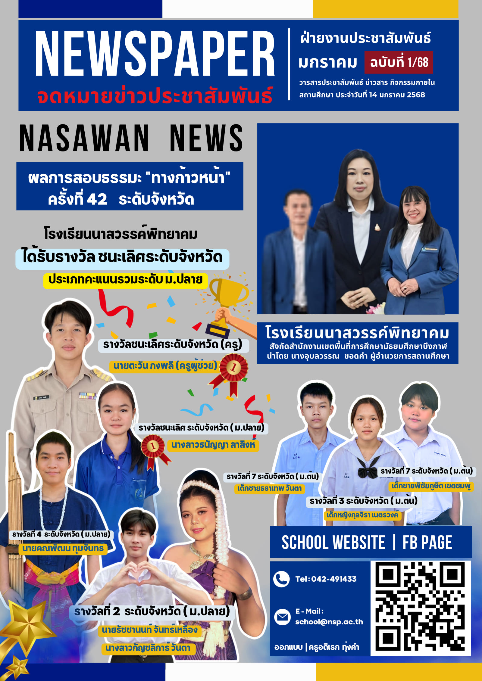 วันที่ 14 มกราคม 2568 : โรงเรียนนาสวรรค์พิทยาคม ขอชื่นชมคุณครูตะวัน กงพลี ที่สามารถสอบตอบปัญหาธรรมมะ "ทางก้าวหน้า" ครั้งที่ 42 ได้รับรางวัล ชนะเลิศ ระดับจังหวัด พร้อมด้วยนักเรียนระดับชั้น ม. ปลาย จำนวน 4 คน และนักเรียนระดับชั้น ม. ต้น จำนวน 3 คน ที่มีผลการสอบในระดับชนะเลิศ และรองชนะเลิศ ตลอดทั้ง ผลคะแนนรวม ชนะเลิศประเภทคะแนนรวม ระดับ ม. ปลาย อีก 1 รางวัลด้วย