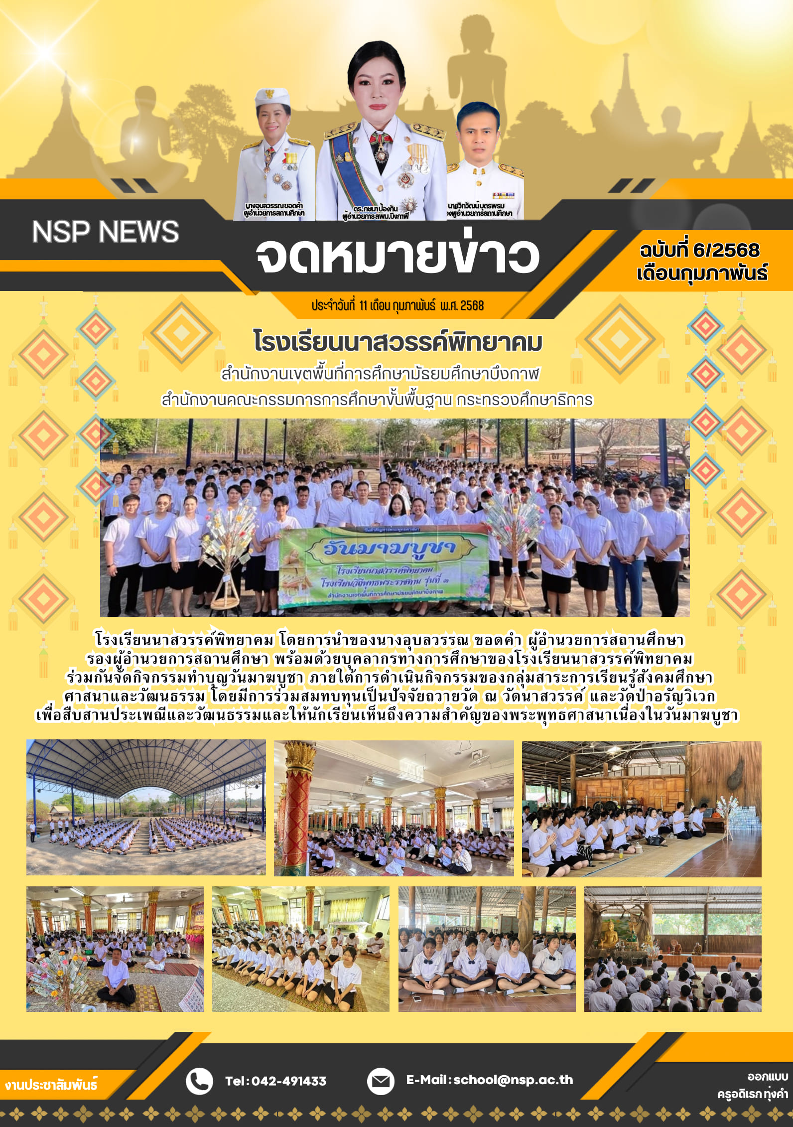 วันที่ 11 กุมภาพันธ์ 2568 : โรงเรียนนาวรรค์พิทยาคม โดยการนำของผู้อำนวยการอุบลวรรณ ขอดคำ พร้อมด้วยคณะผู้บริหาร ครูและบุคลากรทางการศึกษา นักเรียน ได้ดำเนินกิจกรรมทำบุญวันมาฆาบูชา โดยการนำนักเรียนทุกคนเดินทางไปทำกิจกรรมทางพระพุทธศาสนา ณ วัดป่าอรัยวิเวก และวัดนาสวรรค์ ซึ่งเป็นศาสนสถานประจำชุมชน เพื่อเป็นการสร้างคุณลักษณะอันพึงประสงค์ในด้านคุณธรรม จริยธรรมให้กับทุก ๆ คน