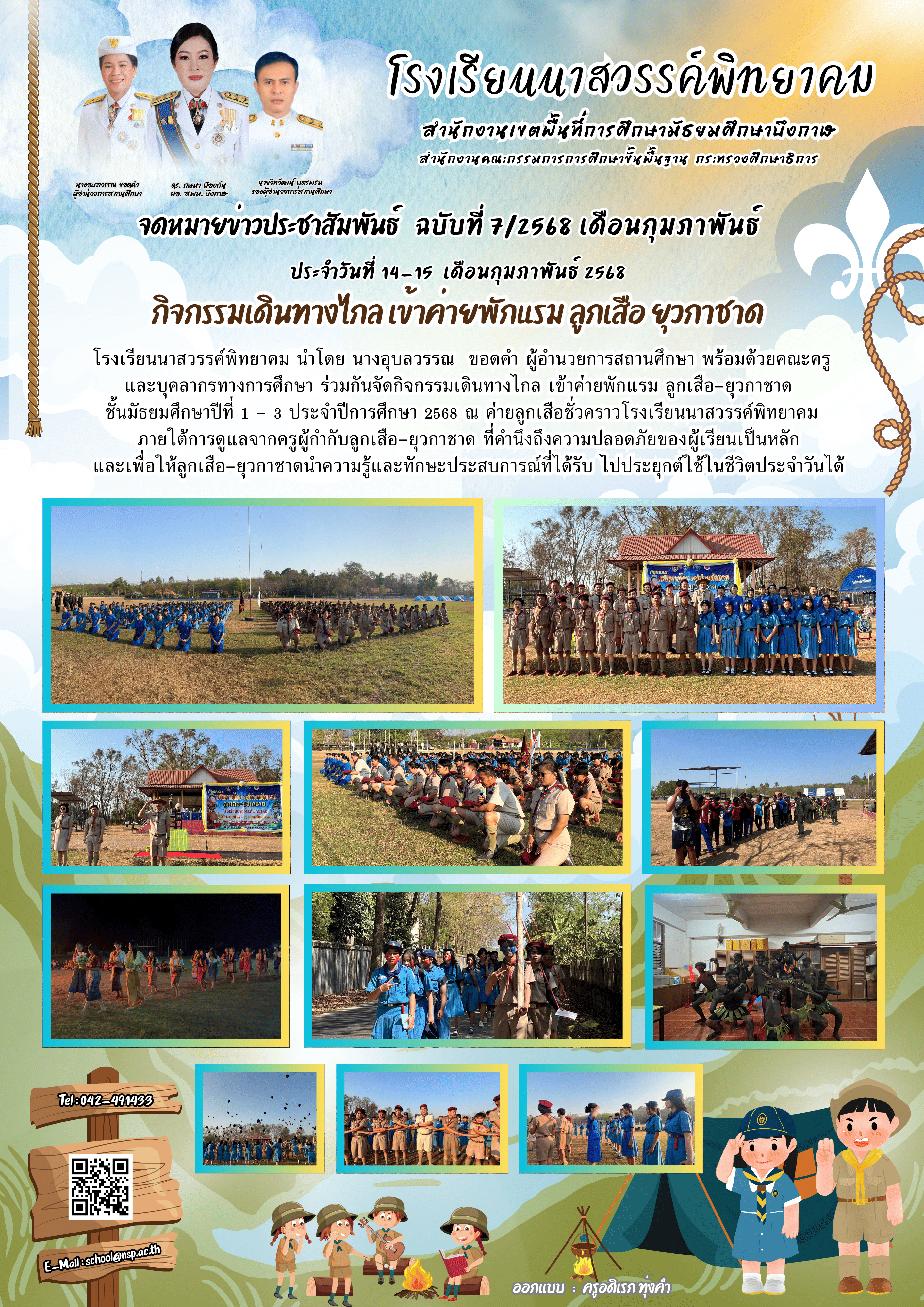 วันที่ 14-15 กุมภาพันธ์ 2568 : โรงเรียนนาสวรรค์พิทยาคม ได้ดำเนินกิจกรรมเดินทางไกลเข้าค่ายพักแรม ณ ค่ายลูกเสือชั่วคราว โรงเรียนนาสวรรค์พิทยาคม โดยมีนักเรียระดับชั้น ม. 1 - 3 ทุกคนเข้าร่วม และวิทยากรในการอบรมครั้งนี้ ประกอบด้วย ครูและบุคลากรของโรงเรียนทุกคน