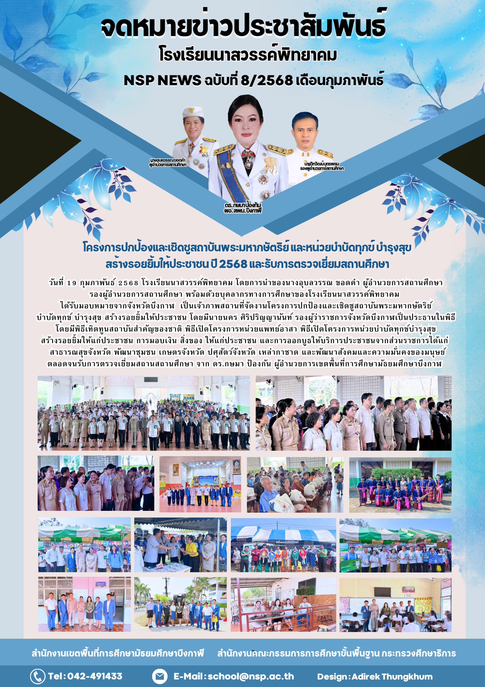 วันที่ 19 กุมภาพันธ์ 2568 : จังหวัดบึงกาฬร่วมกับโรงเรียนนาสวรรค์พิทยาคม ได้จัดกิจกรรมตามโครงการปกป้องและเชิดชูสถาบันพระมหากษัตริย์ และหน่วยบำบัดทุกขื บำรุงสุข สร้างรอยยิ้มให้ประชาชน ปี 2568 โดยมีนายนคร ศิริปัริญญานันท์ รองผู้ว่าราชการจังหวัดบึงกาฬ เป็นประธานในพิธี พร้อมด้วยหัวหน้าส่วนราชการระดับจังหวัด และระดับท้องถิ่นเข้าร่วมกิจกรรมเป็นจำนวนมาก